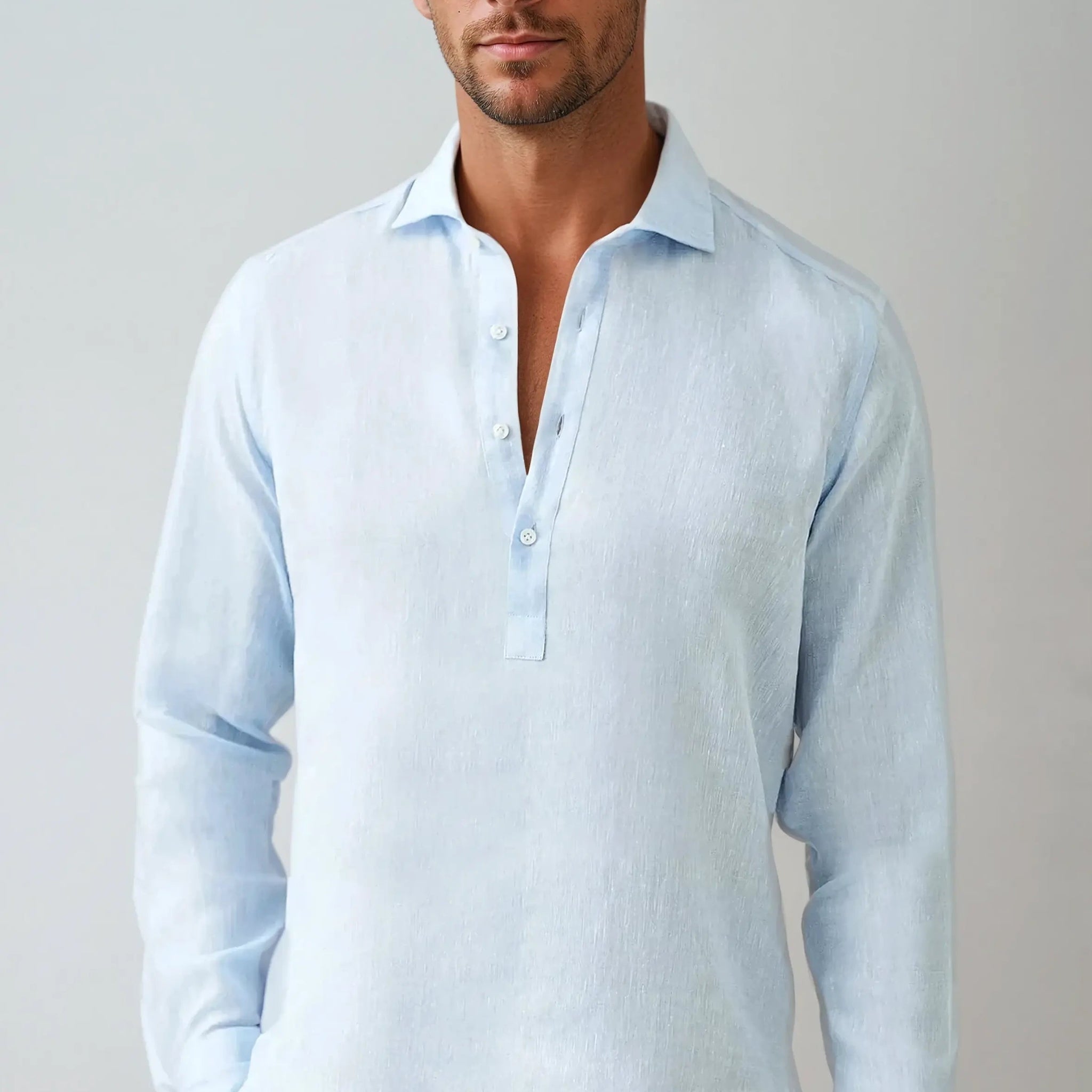 Het linnen pop-over overhemd in lichtblauw combineert verfijnde elegantie met ultiem comfort. De luchtige linnen stof zorgt voor een natuurlijke ademende werking, terwijl het subtiele pop-over design een moderne touch toevoegt. Dit overhemd is ideaal voor mannen die een moeiteloos elegante look willen zonder in te leveren op comfort.